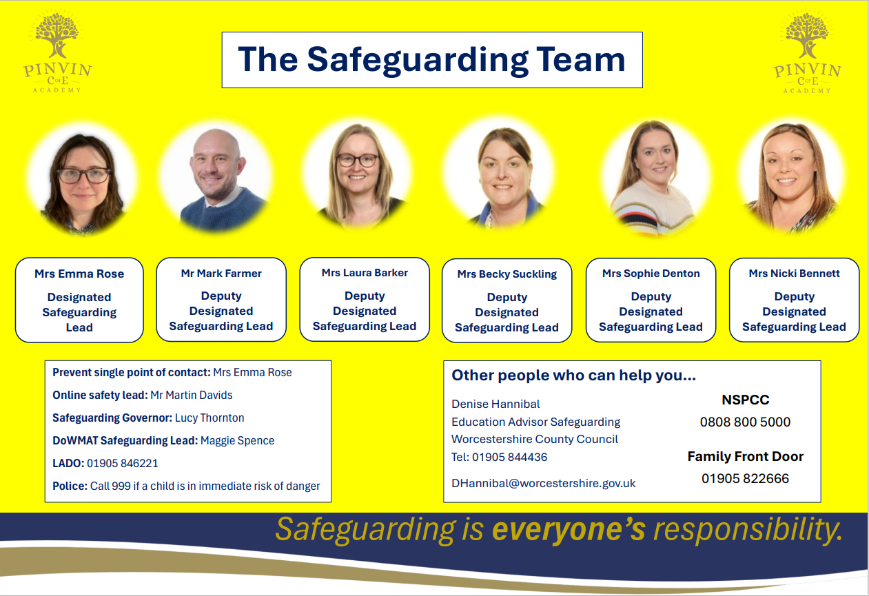 If you have any serious concerns about your child, any other pupil or an adult at Pinvin C of E Academy please do not hesitate to contact the Designated Safeguarding Lead (Mrs Rose) who knows who to contact for the best advice and help and is experienced in using the appropriate degree of confidentiality.